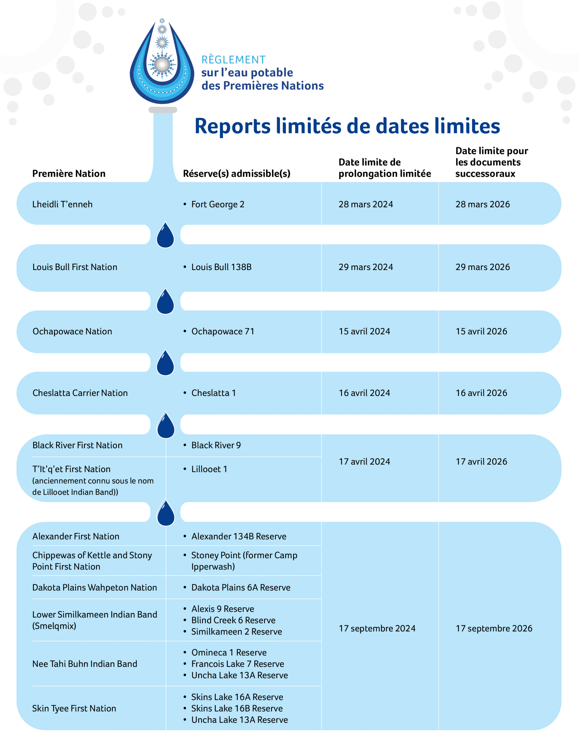 La dernière date limite pour les réclamations était le 7 mars 2024. Par conséquent, pour la plupart des Premières Nations, la date limite pour soumettre ces documents successoraux est le 7 mars 2026. Pour les Premières Nations qui ont été ajoutées au règlement sur la base d’une prolongation limitée, la date limite est fixée à deux ans après leur date limite de prolongation limitée (voir le tableau des dates limites de prolongation limitée). Si l’administrateur ne reçoit pas tous les documents requis (y compris les informations manquantes dans le formulaire de réclamation) à cette date, la réclamation sera close et aucune indemnisation ne sera versée.